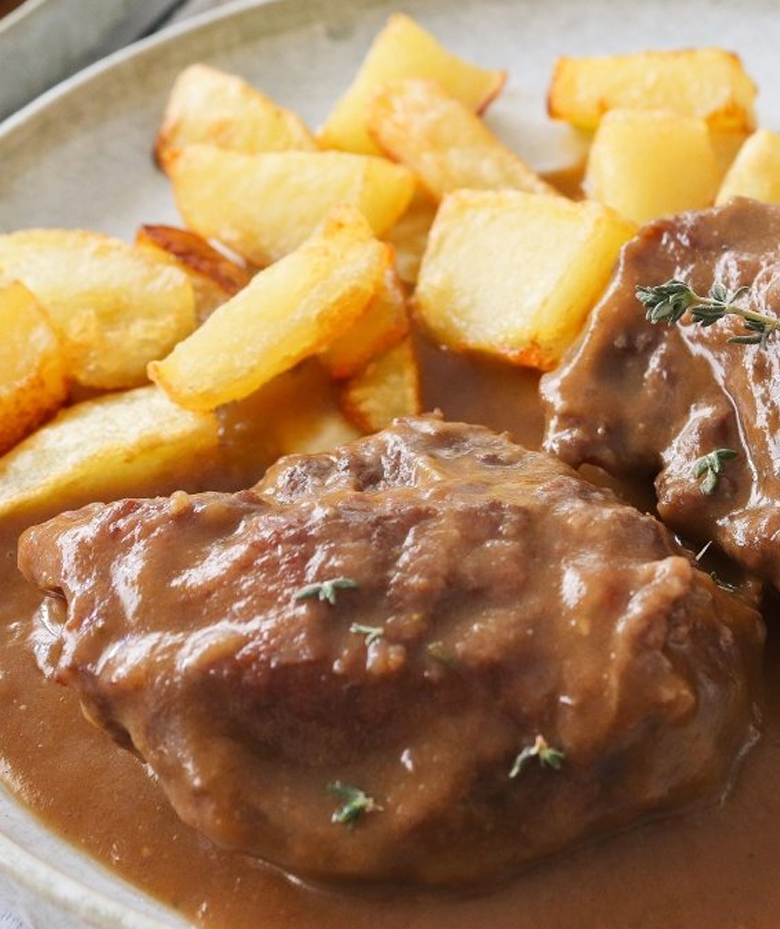 Galtes de Porc amb patates, pa i got de vi o aigua.